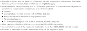 Under this scholarship, students who are domiciles in locations such as Jamshedpur, Kalinganagar, Pantnagar, Faridabad, Pune, Chennai, Tada, and Kolkata can get a scholarship of INR 1,00,000 for 1 year of their ITI/diploma, graduation or postgraduation degree in any of the specified fields.